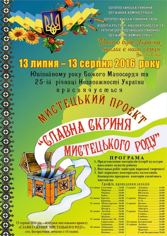 З 13 липня по 11 серпня 2016 року у районі проходитиме мистецький проект "Славна скриня мистецького роду".